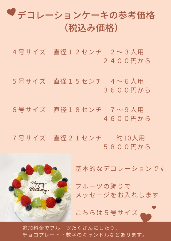 5号サイズのデコレーションケーキから簡単なイラストを描くことができます。フルーツたくさん・チョコレートプレートなど、追加料金で承ります。 その他、ご希望などありましたらご注文の際にお問い合わせください。電話番号 0265-25-1999 水曜日定休 9:30~19:00 長野県飯田市育良町 1-21-10